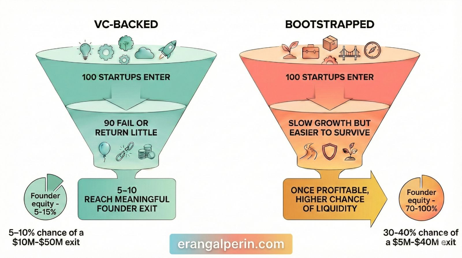 - Bootstrapped and lightly funded companies exit at lower valuations – but do so more frequently, with far higher founder ownership and fewer structural obstacles to getting paid.